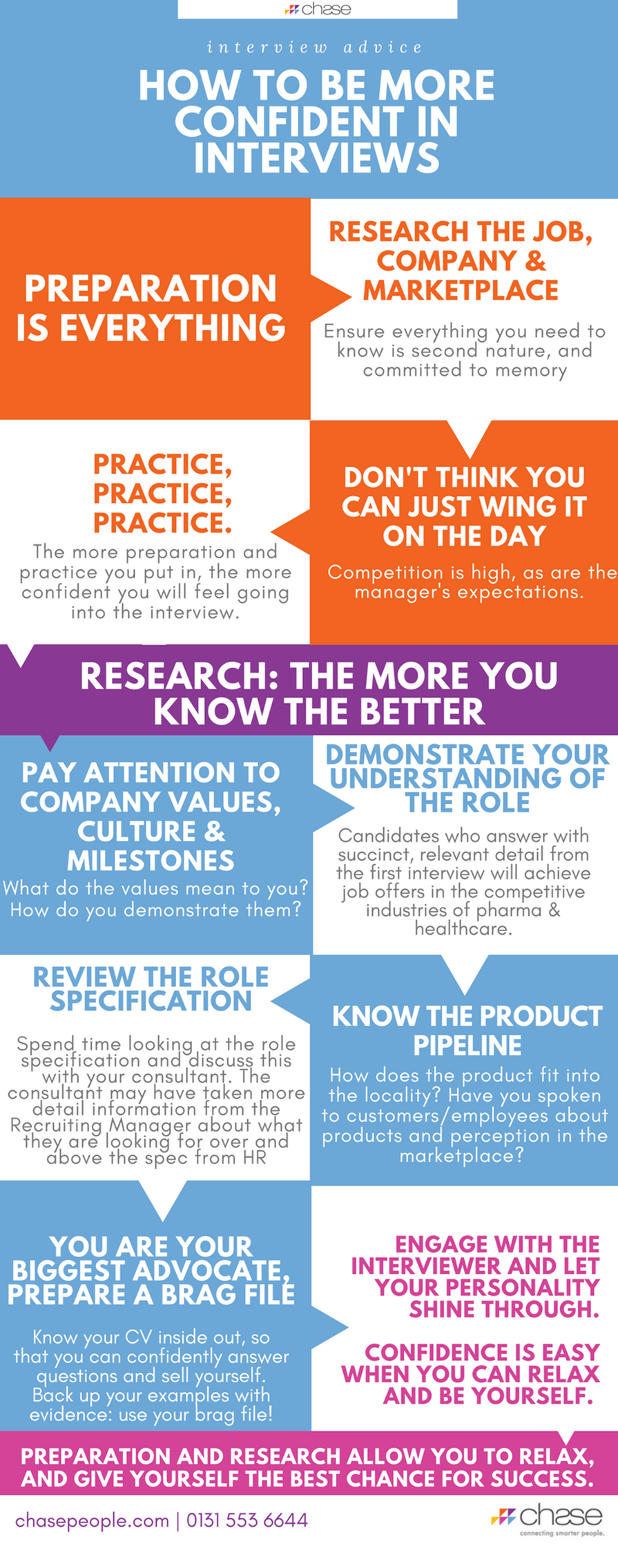 No matter what stage you’re at in your career – whether you’re a graduate or a senior manager – interviews can still be a daunting prospect as nerves begin to set in. We spoke to our pharmaceutical and healthcare recruitment consultants to get their advice on how to feel confident during an interview, and created this handy guide to help you: